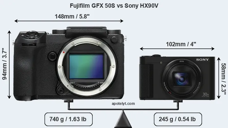 If the front view area (width x height) of the cameras is taken as an aggregate measure of their size, the Sony HX90V is considerably smaller (57 percent) than the Fujifilm GFX 50S. It is worth mentioning in this context that the GFX 50S is splash and dust resistant, while the HX90V does not feature any corresponding weather-sealing.