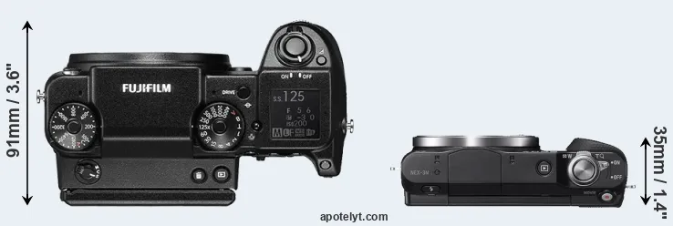If the front view area (width x height) of the cameras is taken as an aggregate measure of their size, the Sony NEX-3N is considerably smaller (51 percent) than the Fujifilm GFX 50S. Moreover, the NEX-3N is substantially lighter (64 percent) than the GFX 50S. It is worth mentioning in this context that the GFX 50S is splash and dust resistant, while the NEX-3N does not feature any corresponding weather-sealing.