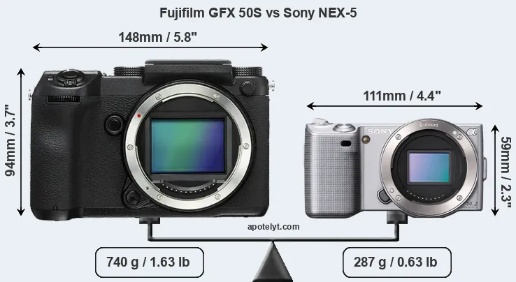 If the front view area (width x height) of the cameras is taken as an aggregate measure of their size, the Sony NEX-5 is considerably smaller (53 percent) than the Fujifilm GFX 50S. Moreover, the NEX-5 is substantially lighter (61 percent) than the GFX 50S. It is worth mentioning in this context that the GFX 50S is splash and dust resistant, while the NEX-5 does not feature any corresponding weather-sealing.