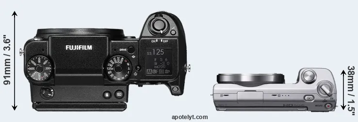 An illustration of the physical size and weight of the Fujifilm GFX 50S and the Sony NEX-5 is provided in the side-by-side display below. The two cameras are presented according to their relative size. Three consecutive views from the front, the top, and the rear side are shown. All width, height and depth dimensions are rounded to the nearest millimeter.