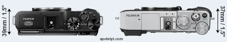 The physical size and weight of the Fujifilm X-A1 and the Fujifilm X-E2S are illustrated in the side-by-side display below. The two cameras are presented according to their relative size. Three consecutive perspectives from the front, the top, and the back are available. All width, height and depth dimensions are rounded to the nearest millimeter.