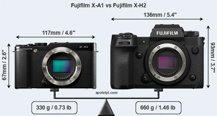 If the front view area (width x height) of the cameras is taken as an aggregate measure of their size, the Fujifilm X-H2 is considerably larger (61 percent) than the Fujifilm X-A1. Moreover, the X-H2 is substantially heavier (100 percent) than the X-A1. It is noteworthy in this context that the X-H2 is splash and dust-proof, while the X-A1 does not feature any corresponding weather-sealing.