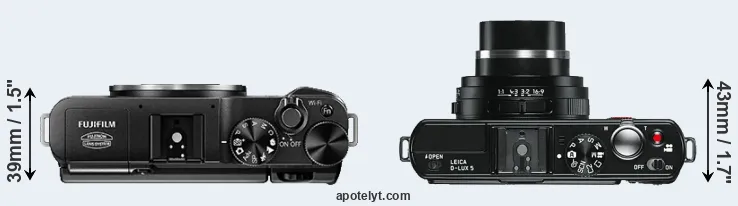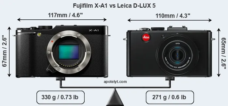 The side-by-side display below illustrates the physical size and weight of the Fujifilm X-A1 and the Leica D-LUX 5. The two cameras are presented according to their relative size. Three consecutive perspectives from the front, the top, and the back are available. All width, height and depth measures are rounded to the nearest millimeter.