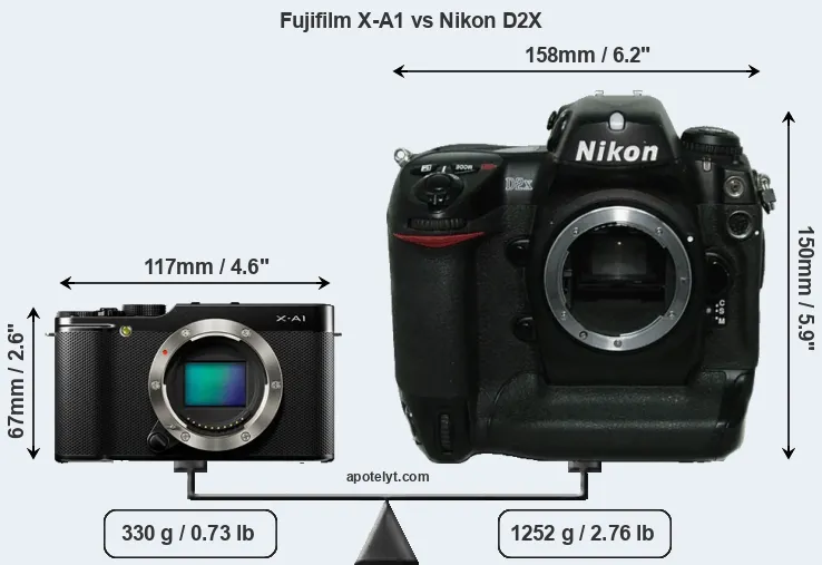 If the front view area (width x height) of the cameras is taken as an aggregate measure of their size, the Nikon D2X is considerably larger (202 percent) than the Fujifilm X-A1. Moreover, the D2X is substantially heavier (279 percent) than the X-A1. It is noteworthy in this context that the D2X is splash and dust-proof, while the X-A1 does not feature any corresponding weather-sealing.