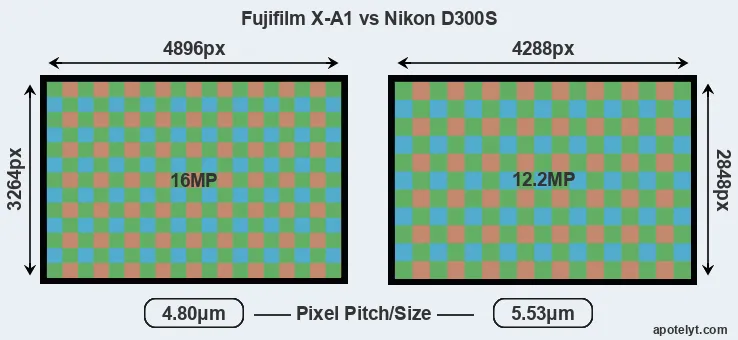 Despite having a slightly smaller sensor, the Fujifilm X-A1 offers a higher resolution of 16 megapixels, compared with 12.2 MP of the Nikon D300S. This megapixels advantage comes at the cost of a higher pixel density and a smaller size of the individual pixel (with a pixel pitch of 4.80μm versus 5.53μm for the D300S). However, it should be noted that the X-A1 is much more recent (by 4 years and 1 month) than the D300S, and its sensor will have benefitted from technological advances during this time that make it possible to gather light more efficiently.