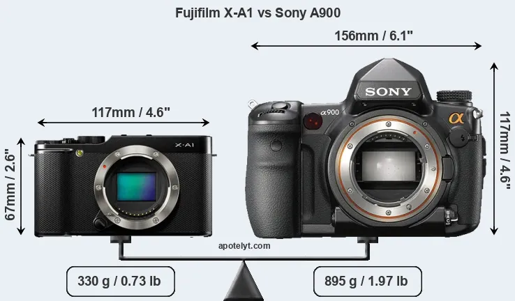 If the front view area (width x height) of the cameras is taken as an aggregate measure of their size, the Sony A900 is considerably larger (133 percent) than the Fujifilm X-A1. Moreover, the A900 is substantially heavier (171 percent) than the X-A1. It is noteworthy in this context that the A900 is splash and dust-proof, while the X-A1 does not feature any corresponding weather-sealing.