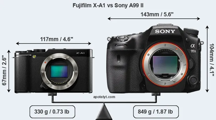 An illustration of the physical size and weight of the Fujifilm X-A1 and the Sony A99 II is provided in the side-by-side display below. The two cameras are presented according to their relative size. Three successive views from the front, the top, and the rear are shown. All width, height and depth measures are rounded to the nearest millimeter.