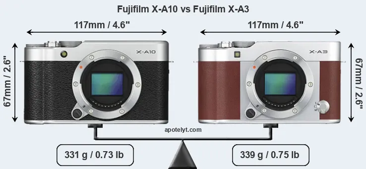 In this particular case, the Fujifilm X-A10 and the Fujifilm X-A3 have exactly the same width and height, and, thus, have identically-sized bodies. However, the X-A3 is slightly heavier (2 percent) than the X-A10. In this context, it is worth noting that neither the X-A10 nor the X-A3 are weather-sealed.