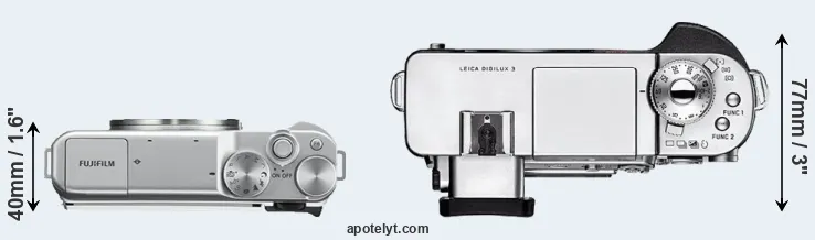 The side-by-side display below illustrates the physical size and weight of the Fujifilm X-A10 and the Leica Digilux 3. The two cameras are presented according to their relative size. Three successive views from the front, the top, and the rear are shown. All width, height and depth dimensions are rounded to the nearest millimeter.