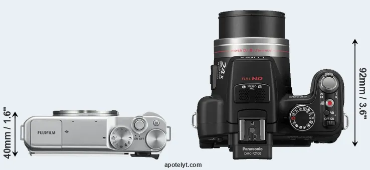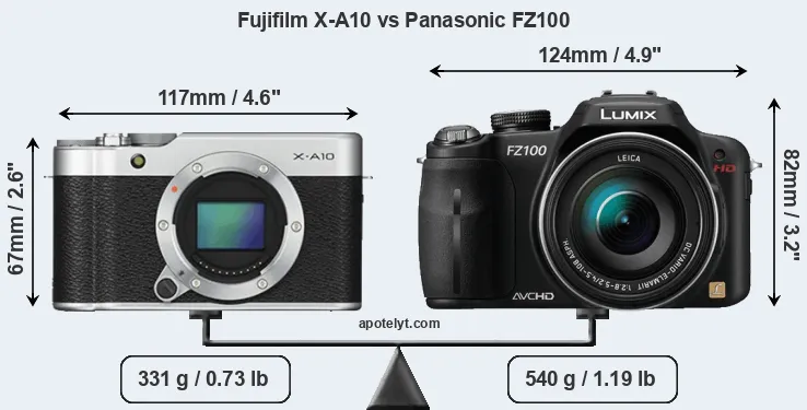 The side-by-side display below illustrates the physical size and weight of the Fujifilm X-A10 and the Panasonic FZ100. The two cameras are presented according to their relative size. Three consecutive perspectives from the front, the top, and the back are available. All width, height and depth measures are rounded to the nearest millimeter.