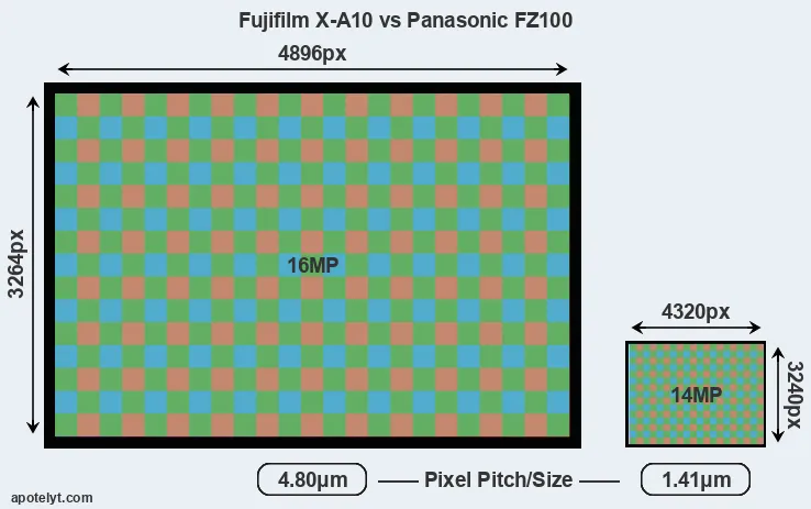 With 16MP, the X-A10 offers a higher resolution than the FZ100 (14MP), but the X-A10 nevertheless has larger individual pixels (pixel pitch of 4.80μm versus 1.41μm for the FZ100) due to its larger sensor. Moreover, the X-A10 is a much more recent model (by 6 years and 4 months) than the FZ100, and its sensor will have benefitted from technological advances during this time that further enhance the light gathering capacity of its pixels. Coming back to sensor resolution, it should be mentioned that the FZ100 has no anti-alias filter installed, so that it can capture all the detail its sensor resolves.