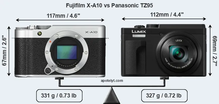 The physical size and weight of the Fujifilm X-A10 and the Panasonic TZ95 are illustrated in the side-by-side display below. The two cameras are presented according to their relative size. Three consecutive views from the front, the top, and the rear side are shown. All width, height and depth dimensions are rounded to the nearest millimeter.