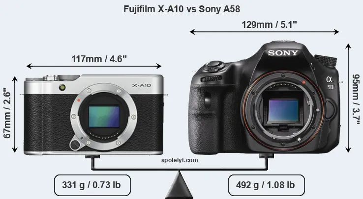 If the front view area (width x height) of the cameras is taken as an aggregate measure of their size, the Sony A58 is considerably larger (56 percent) than the Fujifilm X-A10. Moreover, the A58 is substantially heavier (49 percent) than the X-A10. In this context, it is worth noting that neither the X-A10 nor the A58 are weather-sealed.