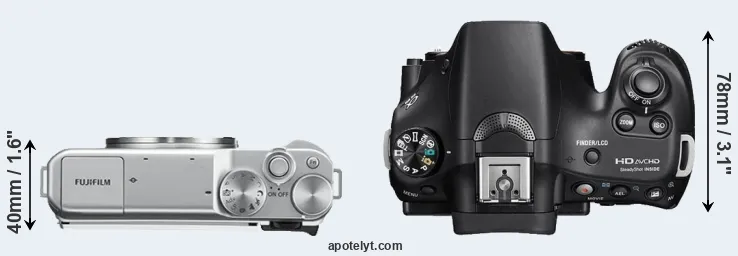 The physical size and weight of the Fujifilm X-A10 and the Sony A58 are illustrated in the side-by-side display below. The two cameras are presented according to their relative size. Three successive views from the front, the top, and the rear are shown. All width, height and depth dimensions are rounded to the nearest millimeter.