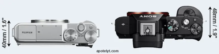 An illustration of the physical size and weight of the Fujifilm X-A10 and the Sony A7R is provided in the side-by-side display below. The two cameras are presented according to their relative size. Three consecutive perspectives from the front, the top, and the back are available. All width, height and depth dimensions are rounded to the nearest millimeter.
