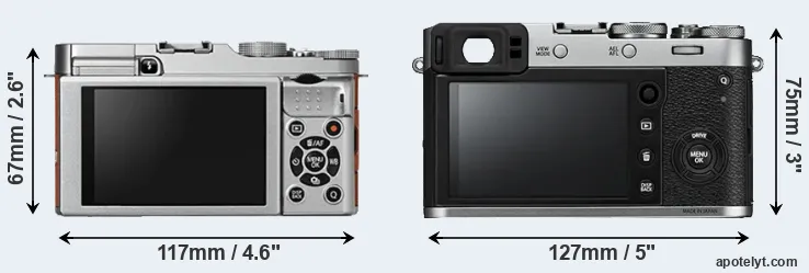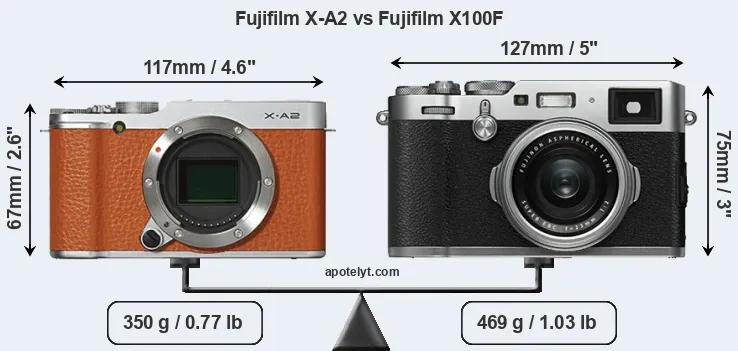 If the front view area (width x height) of the cameras is taken as an aggregate measure of their size, the Fujifilm X100F is notably larger (22 percent) than the Fujifilm X-A2. In this context, it is worth noting that neither the X-A2 nor the X100F are weather-sealed.