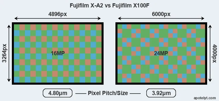 While the two cameras under review share the same sensor size, the X100F offers a higher resolution of 24 megapixels, compared with 16 MP of the X-A2. This megapixels advantage translates into a 23 percent gain in linear resolution. On the other hand, these sensor specs imply that the X100F has a higher pixel density and a smaller size of the individual pixel (with a pixel pitch of 3.92μm versus 4.80μm for the X-A2). However, it should be noted that the X100F is much more recent (by 2 years) than the X-A2, and its sensor will have benefitted from technological advances during this time that compensate for the smaller pixel size. Coming back to sensor resolution, it should be mentioned that the X100F has no anti-alias filter installed, so that it can capture all the detail its sensor resolves.