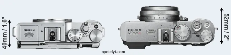 An illustration of the physical size and weight of the Fujifilm X-A2 and the Fujifilm X100F is provided in the side-by-side display below. The two cameras are presented according to their relative size. Three consecutive views from the front, the top, and the rear side are shown. All width, height and depth measures are rounded to the nearest millimeter.