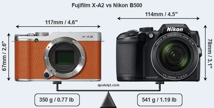 The side-by-side display below illustrates the physical size and weight of the Fujifilm X-A2 and the Nikon B500. The two cameras are presented according to their relative size. Three consecutive perspectives from the front, the top, and the back are available. All size dimensions are rounded to the nearest millimeter.