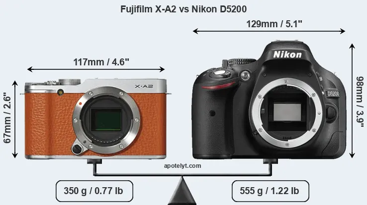 The side-by-side display below illustrates the physical size and weight of the Fujifilm X-A2 and the Nikon D5200. The two cameras are presented according to their relative size. Three consecutive views from the front, the top, and the rear side are shown. All width, height and depth dimensions are rounded to the nearest millimeter.