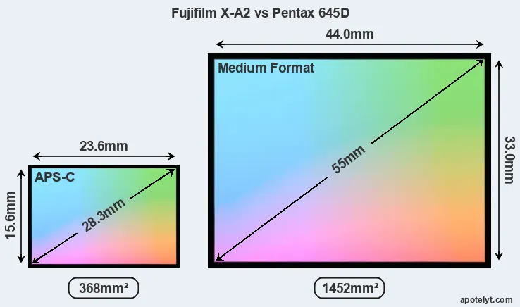 Of the two cameras under consideration, the Fujifilm X-A2 features an APS-C sensor and the Pentax 645D a medium format sensor. The sensor area in the 645D is 295 percent bigger. As a result of these sensor size differences, the cameras have a format factor of, respectively, 1.5 and 0.79. The sensor in the X-A2 has a native 3:2 aspect ratio, while the one in the 645D offers a 4:3 aspect.