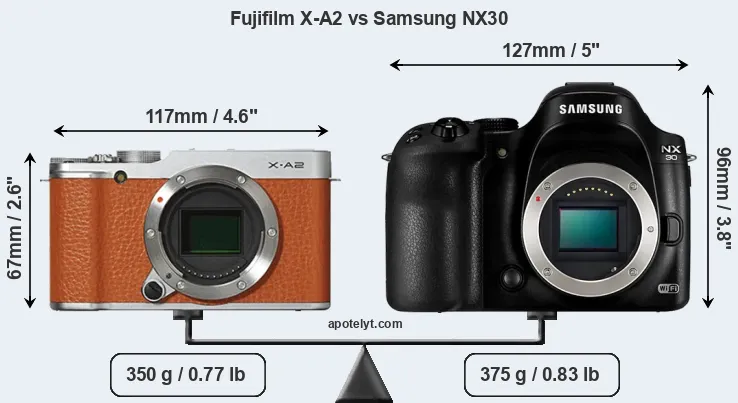 If the front view area (width x height) of the cameras is taken as an aggregate measure of their size, the Samsung NX30 is considerably larger (56 percent) than the Fujifilm X-A2. Moreover, the NX30 is markedly heavier (7 percent) than the X-A2. In this context, it is worth noting that neither the X-A2 nor the NX30 are weather-sealed.