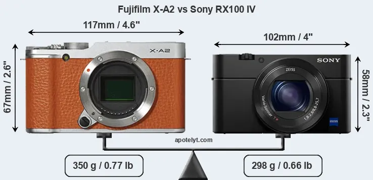 An illustration of the physical size and weight of the Fujifilm X-A2 and the Sony RX100 IV is provided in the side-by-side display below. The two cameras are presented according to their relative size. Three successive views from the front, the top, and the rear are shown. All width, height and depth dimensions are rounded to the nearest millimeter.