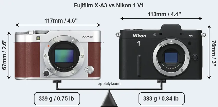 An illustration of the physical size and weight of the Fujifilm X-A3 and the Nikon 1 V1 is provided in the side-by-side display below. The two cameras are presented according to their relative size. Three successive views from the front, the top, and the rear are shown. All size dimensions are rounded to the nearest millimeter.