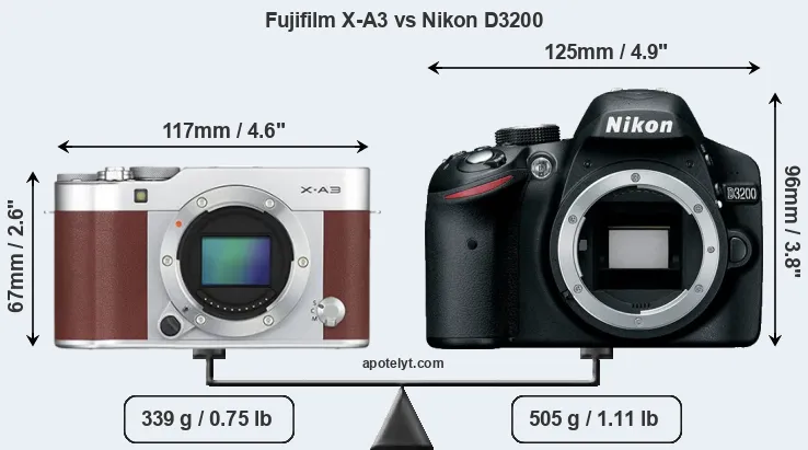 If the front view area (width x height) of the cameras is taken as an aggregate measure of their size, the Nikon D3200 is considerably larger (53 percent) than the Fujifilm X-A3. Moreover, the D3200 is substantially heavier (49 percent) than the X-A3. In this context, it is worth noting that neither the X-A3 nor the D3200 are weather-sealed.