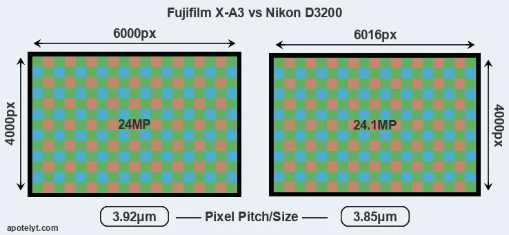 Despite having a slightly smaller sensor, the D3200 offers a slightly higher resolution of 24.1 megapixels, compared with 24 MP of the X-A3. This megapixels advantage comes at the cost of a higher pixel density and a smaller size of the individual pixel (with a pixel pitch of 3.85μm versus 3.92μm for the X-A3). Moreover, it should be noted that the X-A3 is much more recent (by 4 years and 4 months) than the D3200, and its sensor will have benefitted from technological advances during this time that further enhance the light gathering capacity of its pixels.