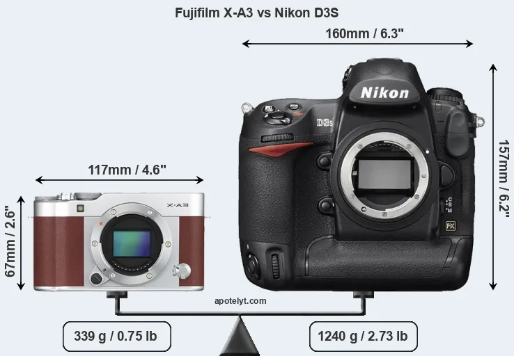 If the front view area (width x height) of the cameras is taken as an aggregate measure of their size, the Nikon D3S is considerably larger (220 percent) than the Fujifilm X-A3. Moreover, the D3S is substantially heavier (266 percent) than the X-A3. It is noteworthy in this context that the D3S is splash and dust-proof, while the X-A3 does not feature any corresponding weather-sealing.
