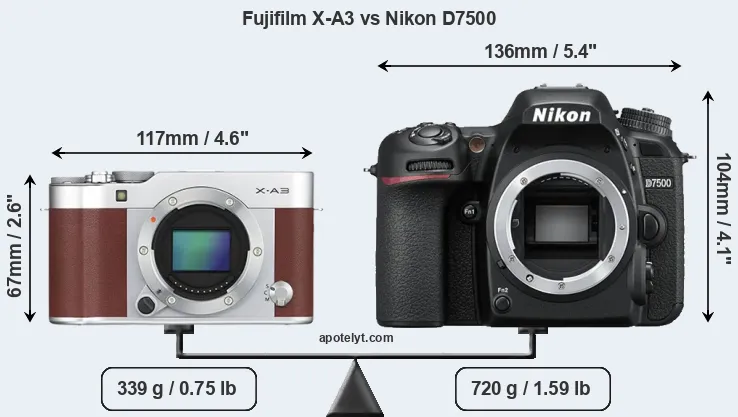 If the front view area (width x height) of the cameras is taken as an aggregate measure of their size, the Nikon D7500 is considerably larger (80 percent) than the Fujifilm X-A3. Moreover, the D7500 is substantially heavier (112 percent) than the X-A3. It is noteworthy in this context that the D7500 is splash and dust-proof, while the X-A3 does not feature any corresponding weather-sealing.