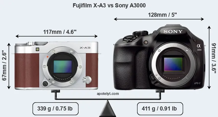 The physical size and weight of the Fujifilm X-A3 and the Sony A3000 are illustrated in the side-by-side display below. The two cameras are presented according to their relative size. Three consecutive perspectives from the front, the top, and the back are available. All width, height and depth dimensions are rounded to the nearest millimeter.