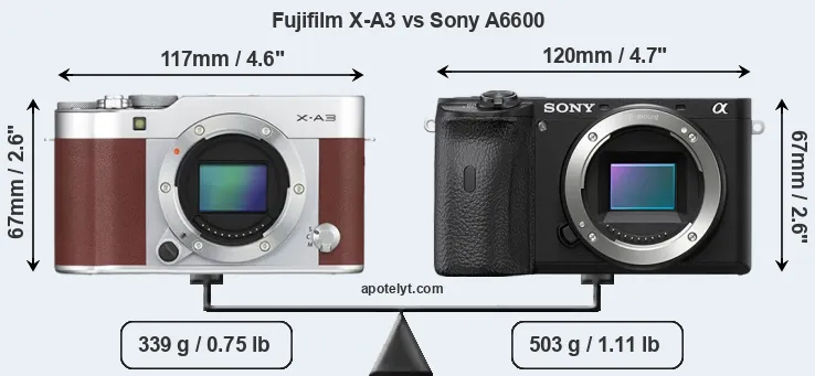 If the front view area (width x height) of the cameras is taken as an aggregate measure of their size, the Sony A6600 is somewhat larger (3 percent) than the Fujifilm X-A3. Moreover, the A6600 is substantially heavier (48 percent) than the X-A3. It is noteworthy in this context that the A6600 is splash and dust-proof, while the X-A3 does not feature any corresponding weather-sealing.