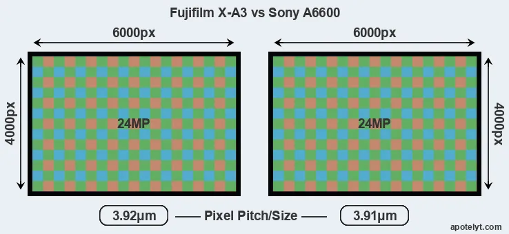 Even though the X-A3 has a slightly larger sensor, both cameras offer the same resolution of 24 megapixels. This implies that the X-A3 has a lower pixel density and larger individual pixels (with a pixel pitch of 3.92μm versus 3.91μm for the A6600), which gives it a potential advantage in terms of light gathering capacity. It should, however, be noted that the A6600 is much more recent (by 3 years) than the X-A3, and its sensor will have benefitted from technological advances during this time that at least partly compensate for the smaller pixel size.