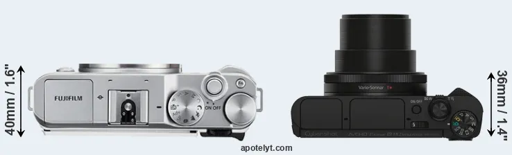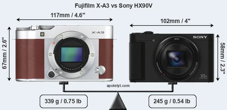 The physical size and weight of the Fujifilm X-A3 and the Sony HX90V are illustrated in the side-by-side display below. The two cameras are presented according to their relative size. Three consecutive views from the front, the top, and the rear side are shown. All width, height and depth dimensions are rounded to the nearest millimeter.