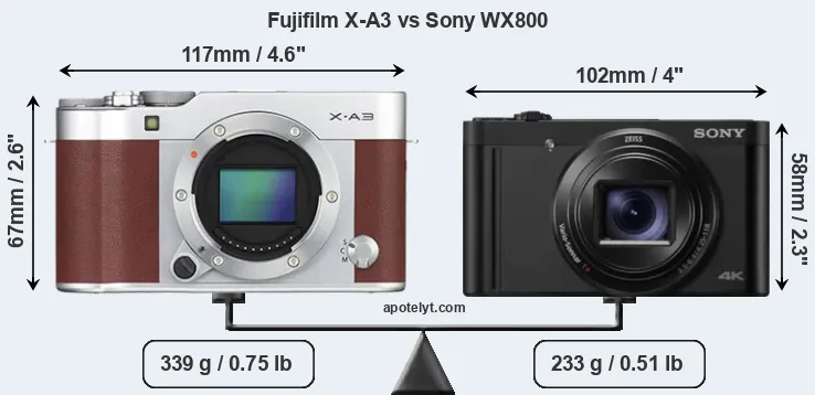 The above size and weight comparisons are to some extent incomplete and possibly misleading, as the WX800 has a lens built in, whereas the X-A3 is an interchangeable lens camera that requires a separate lens. Attaching the latter will add extra weight and bulk to the setup. You can compare the optics available for the X-A3 and their specifications in the Fujinon X Lens Catalog.