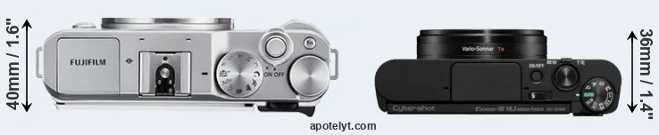 The physical size and weight of the Fujifilm X-A3 and the Sony WX800 are illustrated in the side-by-side display below. The two cameras are presented according to their relative size. Three consecutive views from the front, the top, and the rear side are shown. All width, height and depth dimensions are rounded to the nearest millimeter.