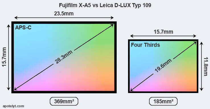 Of the two cameras under consideration, the Fujifilm X-A5 features an APS-C sensor and the Leica D-LUX Typ 109 a Four Thirds sensor. The sensor area in the D-LUX Typ 109 is 50 percent smaller. As a result of these sensor size differences, the cameras have a format factor of, respectively, 1.5 and 2.0. The sensor in the X-A5 has a native 3:2 aspect ratio, while the one in the D-LUX Typ 109 offers a 4:3 aspect. The D-LUX Typ 109 has the particularity of featuring a switch that allows to toggle between multiple aspect ratios, while maintaining the same field of view and full image resolution.
