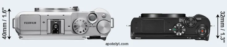 The side-by-side display below illustrates the physical size and weight of the Fujifilm X-A5 and the Nikon 1 J5. The two cameras are presented according to their relative size. Three consecutive perspectives from the front, the top, and the back are available. All width, height and depth measures are rounded to the nearest millimeter.