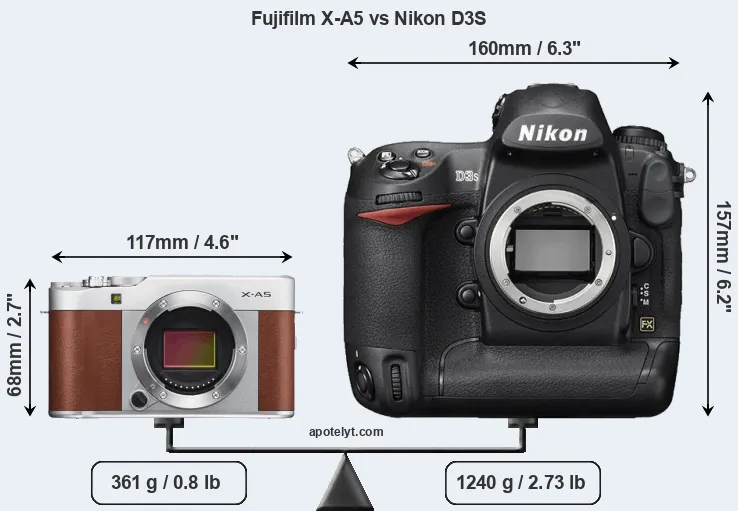 If the front view area (width x height) of the cameras is taken as an aggregate measure of their size, the Nikon D3S is considerably larger (216 percent) than the Fujifilm X-A5. Moreover, the D3S is substantially heavier (243 percent) than the X-A5. It is noteworthy in this context that the D3S is splash and dust-proof, while the X-A5 does not feature any corresponding weather-sealing.