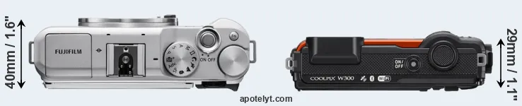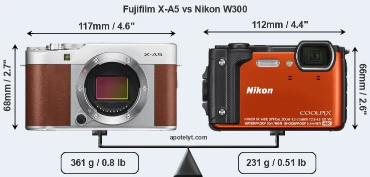 The physical size and weight of the Fujifilm X-A5 and the Nikon W300 are illustrated in the side-by-side display below. The two cameras are presented according to their relative size. Three consecutive perspectives from the front, the top, and the back are available. All width, height and depth measures are rounded to the nearest millimeter.