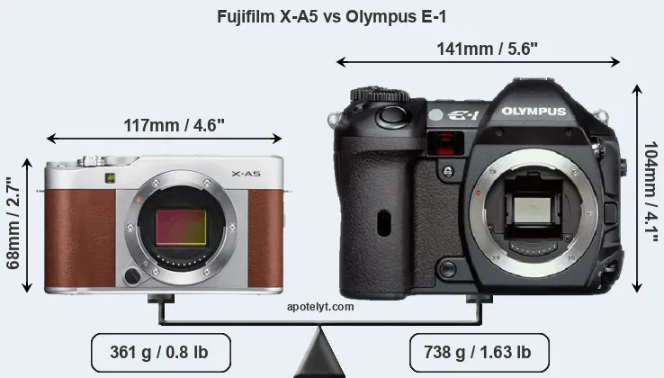 If the front view area (width x height) of the cameras is taken as an aggregate measure of their size, the Olympus E-1 is considerably larger (84 percent) than the Fujifilm X-A5. Moreover, the E-1 is substantially heavier (104 percent) than the X-A5. It is noteworthy in this context that the E-1 is splash and dust-proof, while the X-A5 does not feature any corresponding weather-sealing.