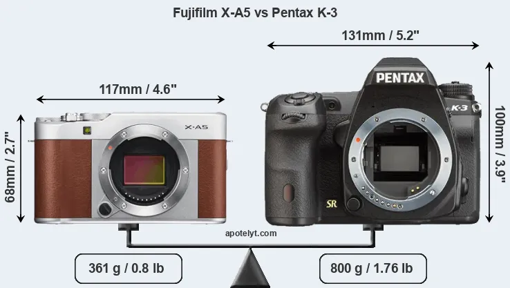 The physical size and weight of the Fujifilm X-A5 and the Pentax K-3 are illustrated in the side-by-side display below. The two cameras are presented according to their relative size. Three consecutive perspectives from the front, the top, and the back are available. All width, height and depth dimensions are rounded to the nearest millimeter.