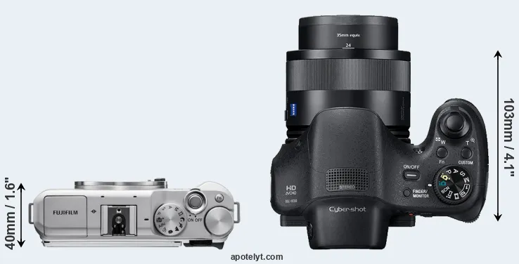 The physical size and weight of the Fujifilm X-A5 and the Sony HX350 are illustrated in the side-by-side display below. The two cameras are presented according to their relative size. Three consecutive views from the front, the top, and the rear side are shown. All size dimensions are rounded to the nearest millimeter.