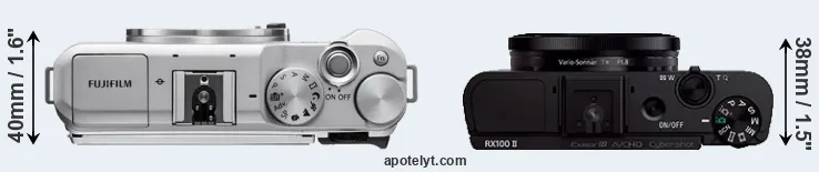 The physical size and weight of the Fujifilm X-A5 and the Sony RX100 II are illustrated in the side-by-side display below. The two cameras are presented according to their relative size. Three successive views from the front, the top, and the rear are shown. All width, height and depth measures are rounded to the nearest millimeter.