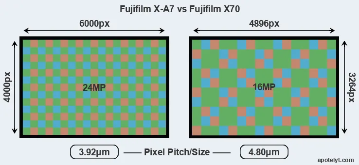 With 24MP, the X-A7 offers a higher resolution than the X70 (16MP), but the X-A7 has smaller individual pixels (pixel pitch of 3.92μm versus 4.80μm for the X70). However, the X-A7 is a much more recent model (by 3 years and 7 months) than the X70, and its sensor will have benefitted from technological advances during this time that enhance the light gathering capacity of its pixels. Coming back to sensor resolution, it should be mentioned that the X70 has no anti-alias filter installed, so that it can capture all the detail its sensor resolves.