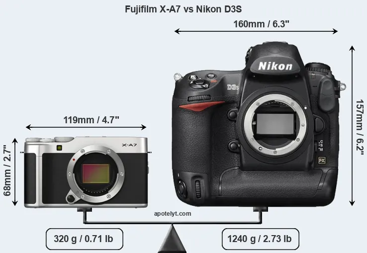If the front view area (width x height) of the cameras is taken as an aggregate measure of their size, the Nikon D3S is considerably larger (210 percent) than the Fujifilm X-A7. Moreover, the D3S is substantially heavier (288 percent) than the X-A7. It is noteworthy in this context that the D3S is splash and dust-proof, while the X-A7 does not feature any corresponding weather-sealing.