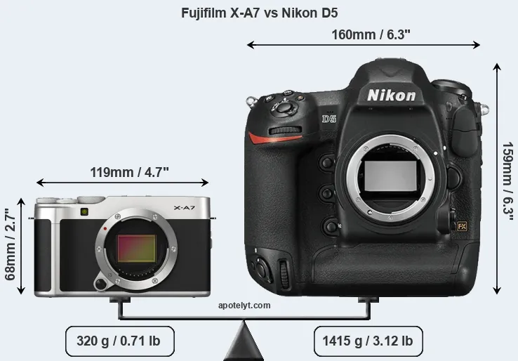 If the front view area (width x height) of the cameras is taken as an aggregate measure of their size, the Nikon D5 is considerably larger (214 percent) than the Fujifilm X-A7. Moreover, the D5 is substantially heavier (342 percent) than the X-A7. It is noteworthy in this context that the D5 is splash and dust-proof, while the X-A7 does not feature any corresponding weather-sealing.