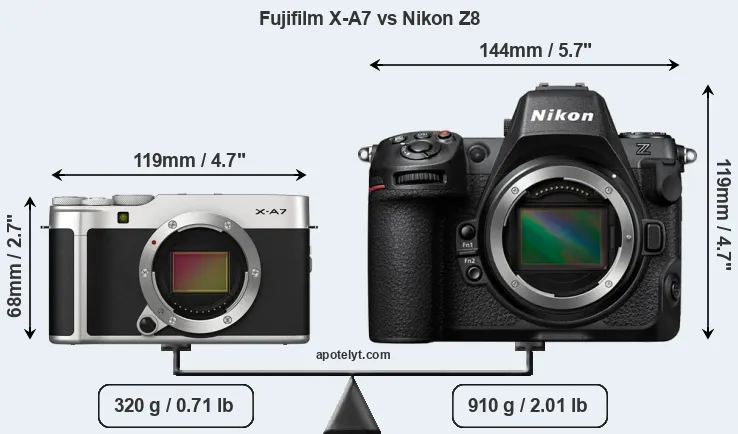 If the front view area (width x height) of the cameras is taken as an aggregate measure of their size, the Nikon Z8 is considerably larger (112 percent) than the Fujifilm X-A7. Moreover, the Z8 is substantially heavier (184 percent) than the X-A7. It is noteworthy in this context that the Z8 is splash and dust-proof, while the X-A7 does not feature any corresponding weather-sealing.
